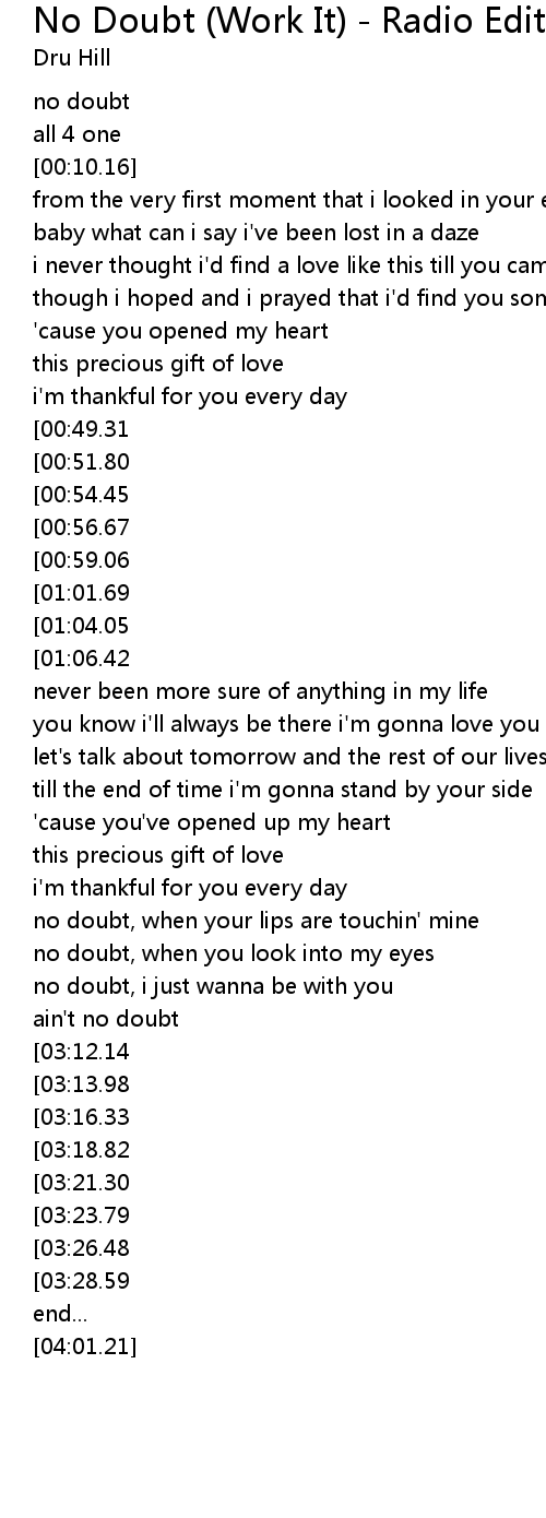 | [02:05.42][01:06.42] | ain't no doubt about it |