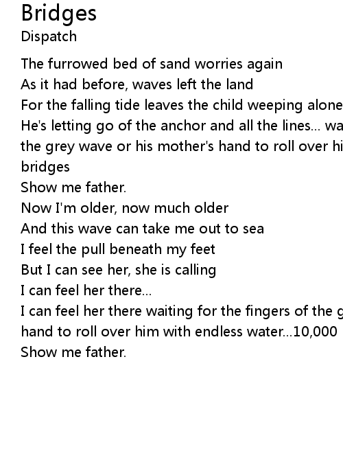 I can feel her there waiting for the fingers of the grey wave or his mother's hand to roll over him with endless water...10,000 bridges |