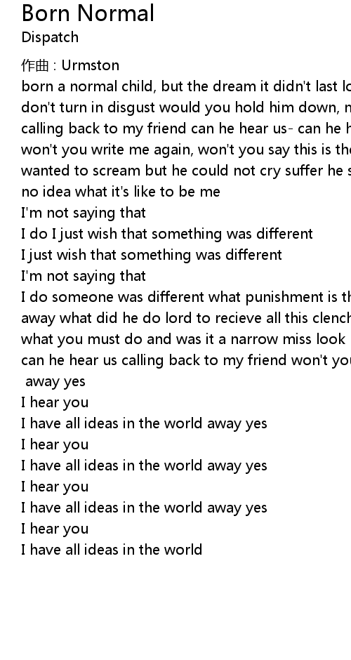 | born a normal child, but the dream it didn' t last long someone do somethign, don' t turn in disgust would you hold him down, my god why does he hang on calling back to my friend can he hear us can he hear us look him in the eyes won' t you write me again, won' t you say this is the end eight years gone by wanted to scream but he could not cry suffer he so gallantly he says, you have no idea what it' s like to be me | |