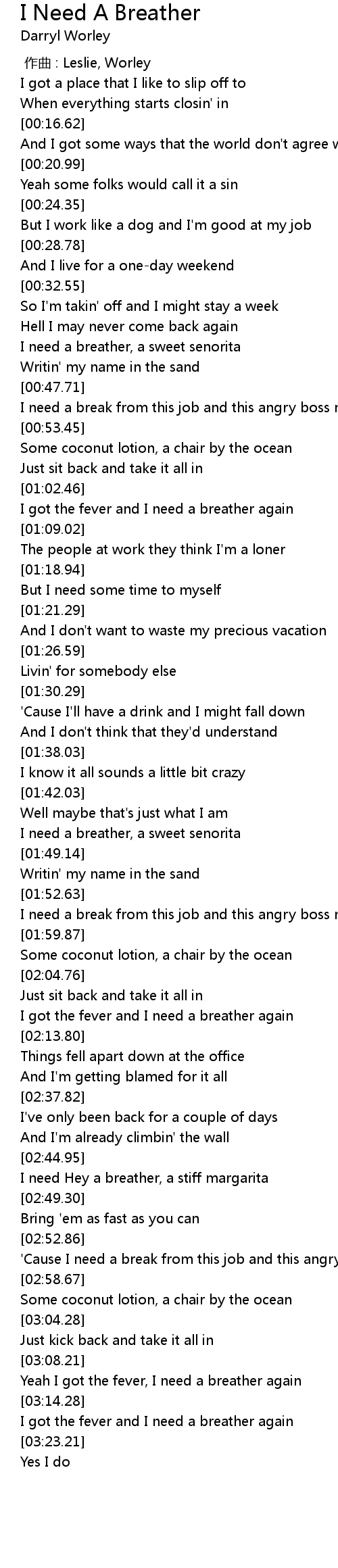 | [02:46.94] | I need Hey a breather, a stiff margarita |