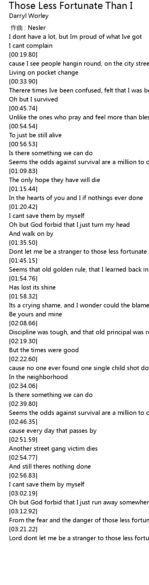 | [03:25.52] | Lord dont let me be a stranger to those less fortunate than i |