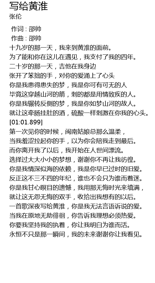 | [02:10.141] | 一首歌深夜写给黄淮,你是我无法言语诉说的爱。 |