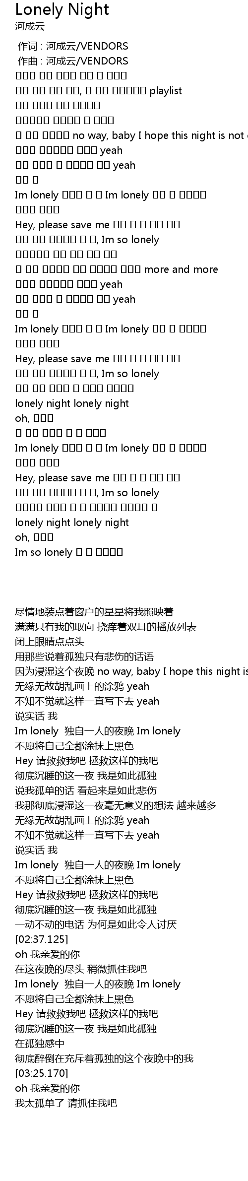 | [02:00.491] | Im lonely 혼자인 이 밤 Im lonely 온통 날 칠해버린 어둠이 싫어요 |