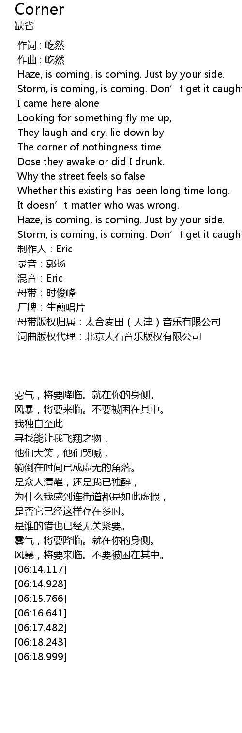 | [06:18.243] | 母带版权归属:太合麦田(天津)音乐有限公司 |