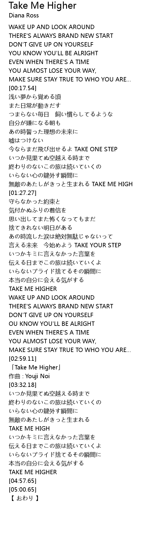 | [01:18.24] | 無敵のあたしがきっと生まれる TAKE ME HIGH |