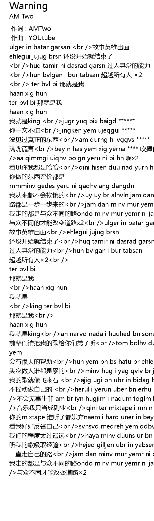 | [02:13.192] | 看我好好反省自己<br />svnsvd medreh yem qdbvr bl astn 我们的程度太过遥远<br />haya minv duuns ur bn qi alt ab 听我的歌吸取经验<br />hejeq gilljen ubr in yabsen jam dan 一直走自己的路<br />jam dan minv mur yemr ni ondo 我走的都是与众不同的路ondo minv mur yemr ni jam dan <br />与众不同才能改变道路×2 |