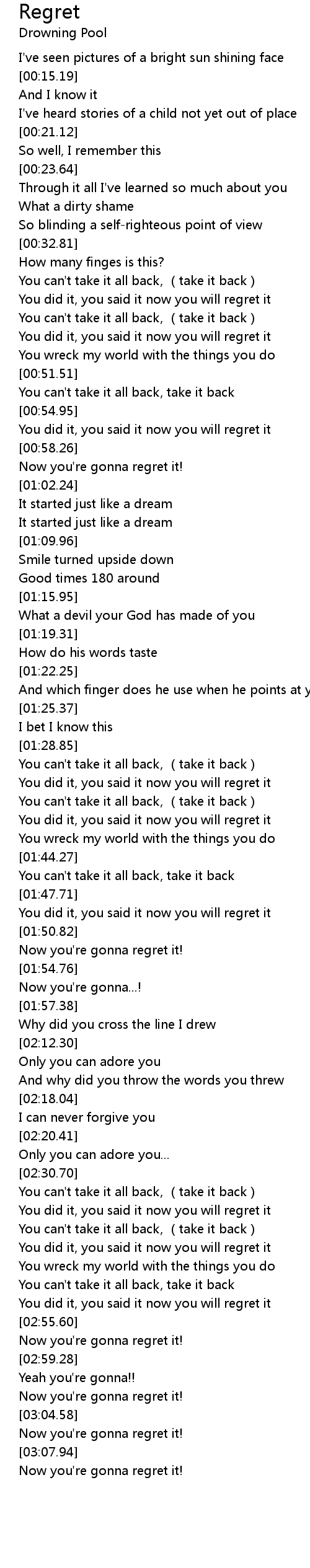 | [00:38.62] | You did it, you said it now you will regret it |