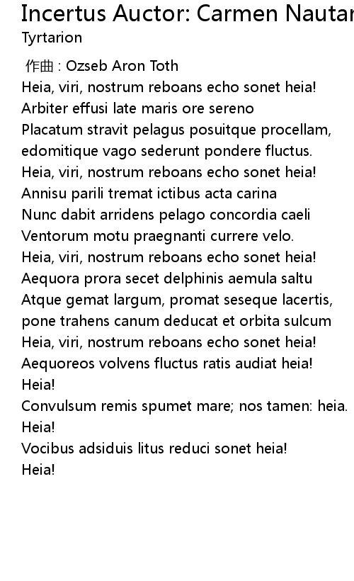 | [01:53.40] | Aequoreos volvens fluctus ratis audiat heia! |