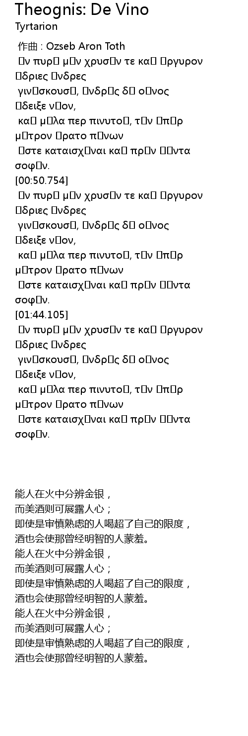[01:06.852] γινώσκουσ᾿, ἀνδρὸς δ᾿ οἶνος ἔδειξε νόον,