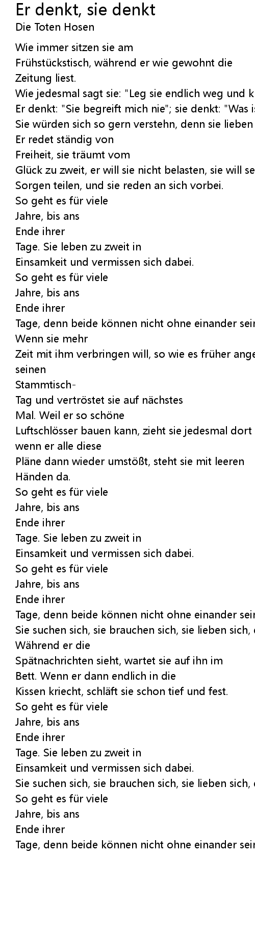 | Sie wü rden sich so gern verstehn, denn sie lieben sich beide so. | |