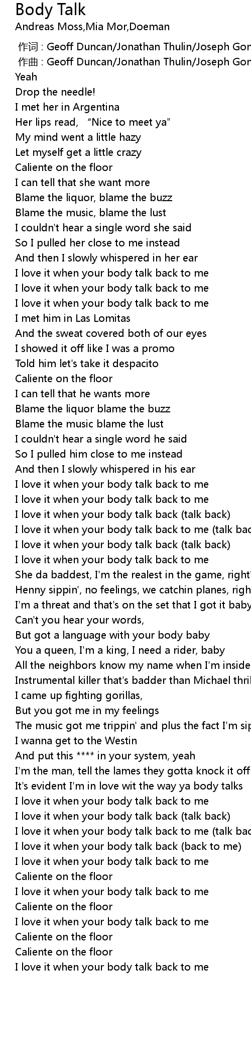 | [01:45.33] | I love it when your body talk back to me (talk back) |