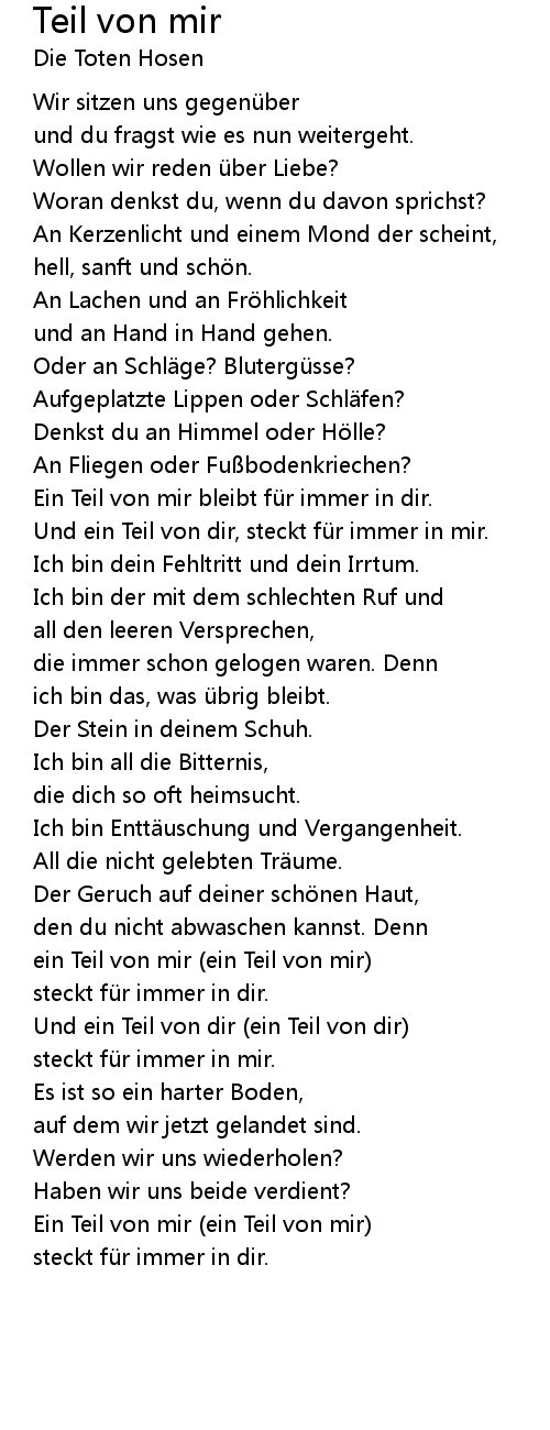 | Ein Teil von mir bleibt fü r immer in dir. | |