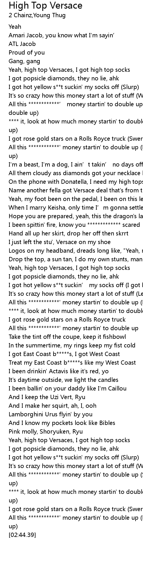 | [02:18.43] | Yeah, high top Versaces, I got high top socks |