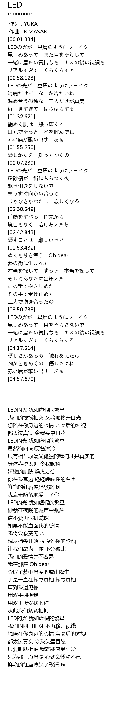| [02:07.637] | LEDの光が 星屑のようにフェイク |