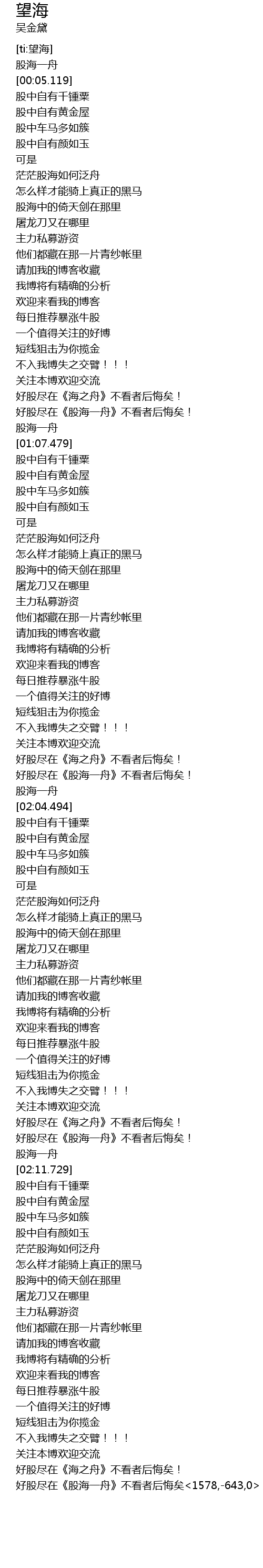 | [01:00.911] | 好股尽在《股海一舟》不看者后悔矣! |