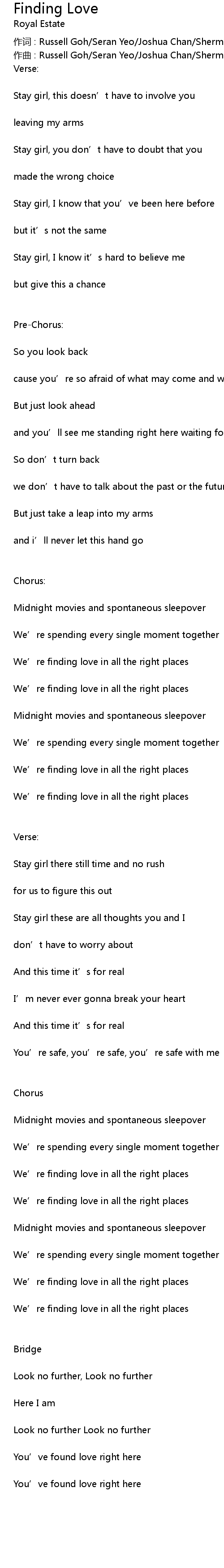 | 作词 : Russell Goh/Seran Yeo/Joshua Chan/Sherman Lee | |