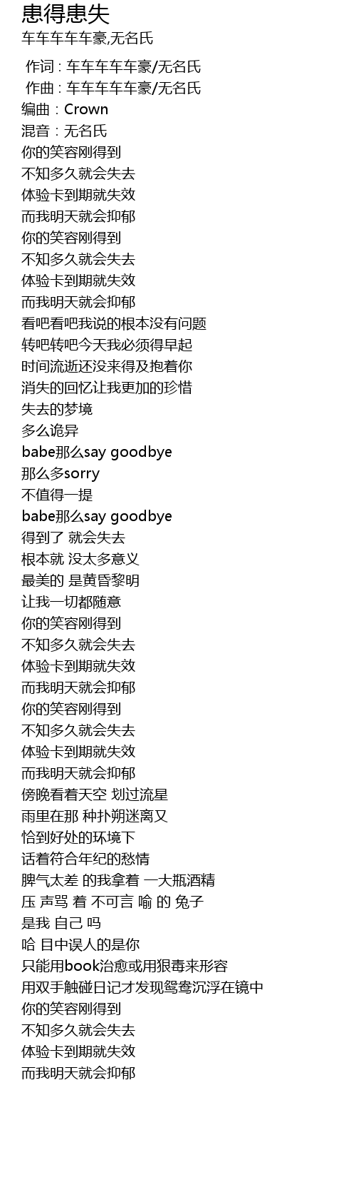 | [00:00.000] | 作词 : 车车车车车豪/无名氏 |