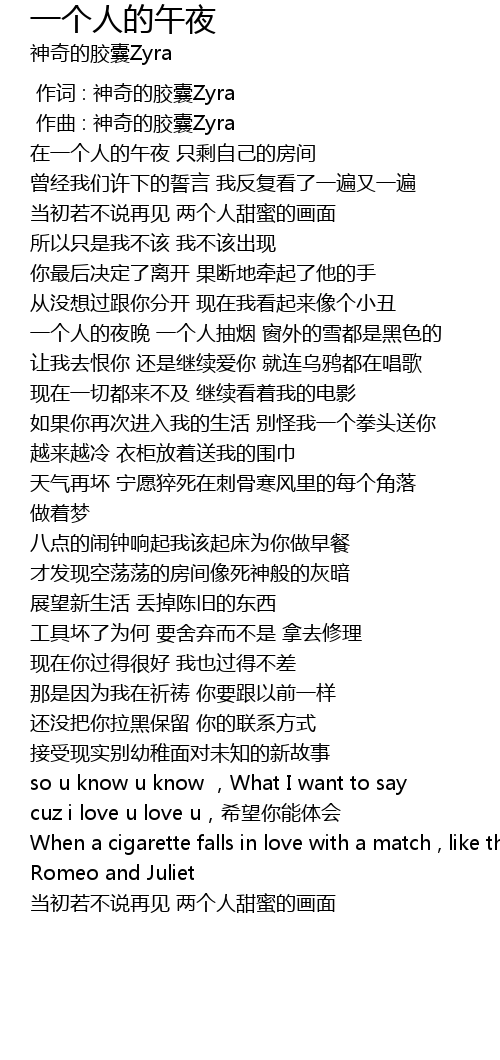 | [00:55.316] | 一个人的夜晚 一个人抽烟 窗外的雪都是黑色的 |