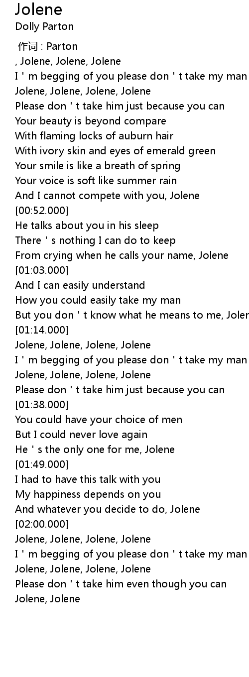 | [02:12.500] | Jolene, Jolene, Jolene, Jolene |