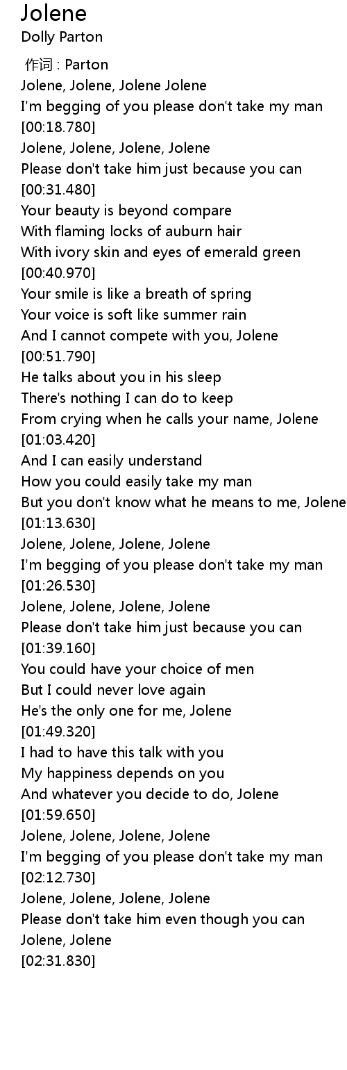 | [00:58.910] | From crying when he calls your name, Jolene |