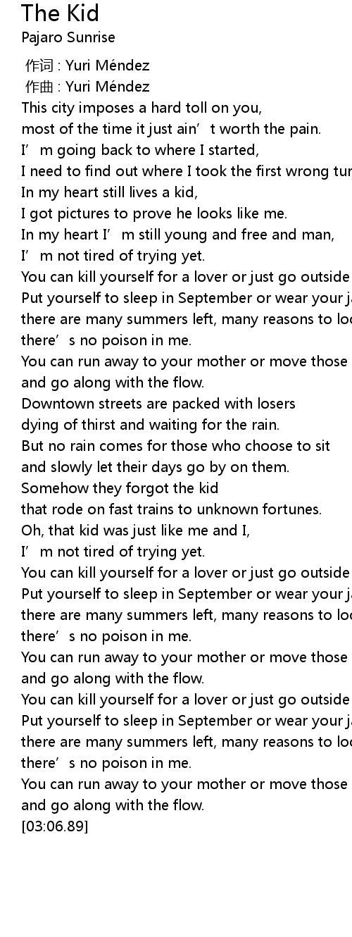 | [02:43.00] | Put yourself to sleep in September or wear your jacket on and remember |
