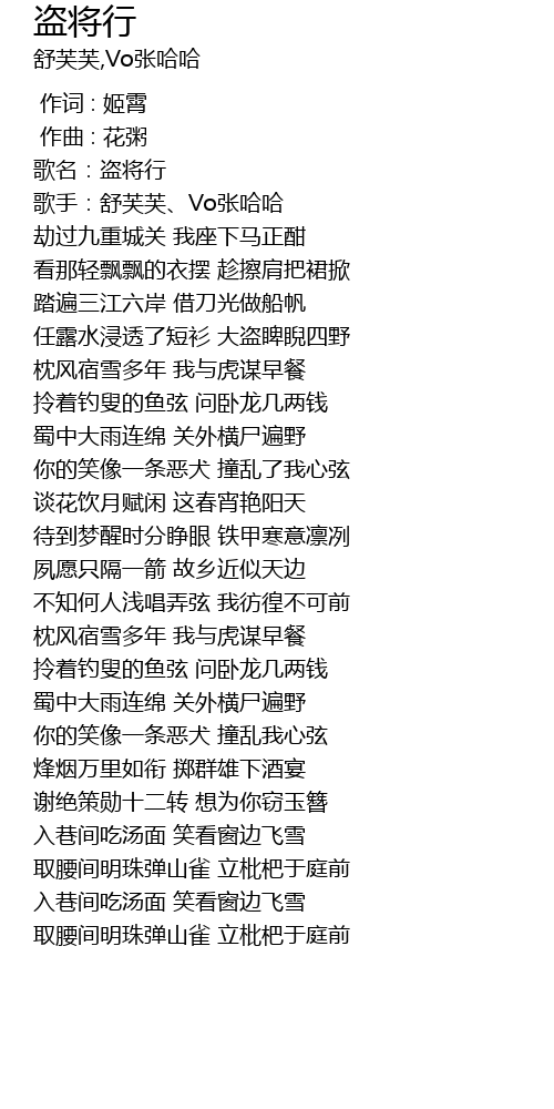 | [00:10.00] | 歌手:舒芙芙、Vo张哈哈 |