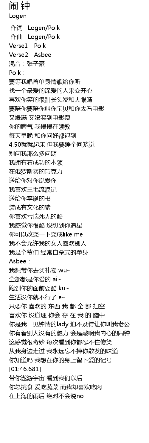 | [01:34.182] | 你有着别人没有的魅力 会是敲响我内心的闹钟 |