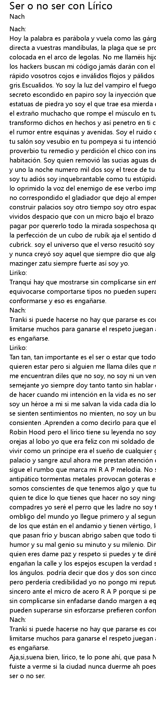 | Tan tan, tan importante es el ser o estar que todos quieren ser que todos quieren estar pero si alguien me llama diles que no estoy ´´esta bien´´ si me encuentran diles que no soy, no soy ni un vendido ni un farsante ni nada semejante yo siempre doy tanto tanto sin hablar de cuanto cuanto es lo que trato de hacer cuando mi intención en la vida es no ser para llegar a ser. No soy, no soy un héroe a mi si me salvan la vida cada día los pequeños gestos todavía se sienten sentimientos no mienten, no soy un buen ejemplo pero tus papas me consienten .Aprenden a como decirlo para que el mundo lo entienda yo no soy Robin Hood pero el lírico tiene su leyenda no soy un bobo escapo si veo las orejas al lobo yo que era feliz con mi soldado de plomo y mi globo, quería vivir como un príncipe era el sueño de cualquier gandul pero ellos tienen un palacio y sangre azul ahora me prestan atención como a un guía y así la peña sigue el rumbo que marca mi R A P melodía. No soy ni tan simpático ni tan antipático tormentas metales provocan goteras en el ático tenemos el hip-hop somos conscientes de que tenemos algo y que tu eres alguien y que yo no soy quien te dice lo que tienes que hacer no soy ningún padre cuido de mis compadres yo seré el perro que les ladre no soy tu enemigo ni me creo el ombligo del mundo yo llegue primero y al segundo le pasé mi testigo en memoria de los que están en el andamio y tienen vértigo, los que recogen trigo, los que pasan frío y buscan abrigo saben que todo tiene su castigo y su premio, su humor y su mal genio su minuto y su milenio. Dime con quien andas y te diré quien eres dame paz y respeto si puedes y te diré como eres las apariencias engañan la calle y los espejos escupen la verdad sin escrúpulos desde todos los ángulos. podría decir que dos y dos son cinco y mucha peña lo creería pero perdería credibilidad yo no pongo mi reputación en juego solo un gesto sincero ante el micro de acero R A P porque si pero tranqui hay que mostrarse sin complicarse sin enfadarse dando margen a equivocarse comportarse tipos no pueden superarse sin esforzarse prefieren conformarse y eso es engañarse. | |