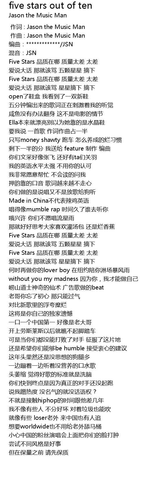 | [01:35.951] | Five Stars 品质在哪 质量太差 太差 |