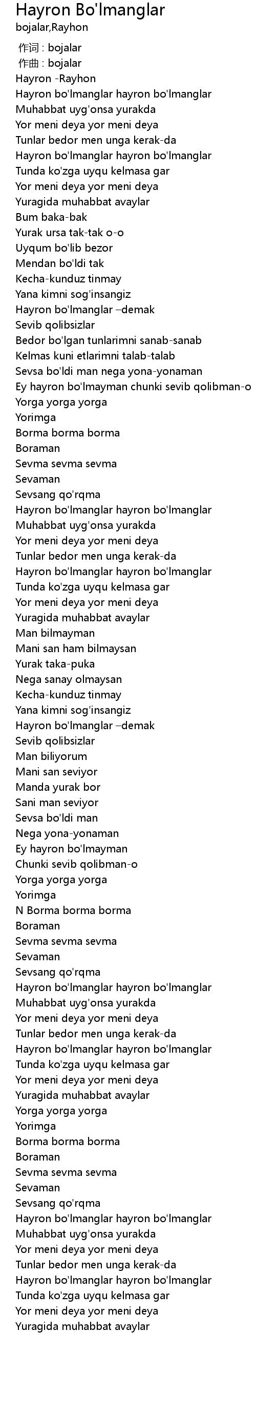 | [02:37.72] | Hayron bo' lmanglar hayron bo' lmanglar |