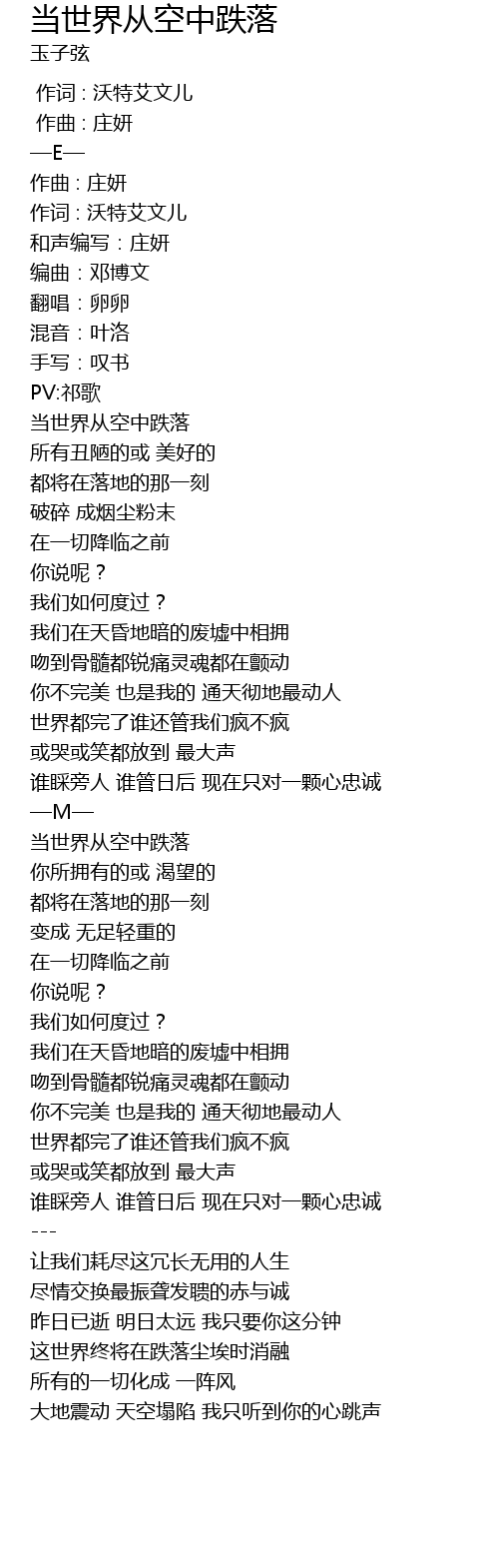 | [00:28.007] | dāng shì jiè cóng kōng zhōng diē luò |