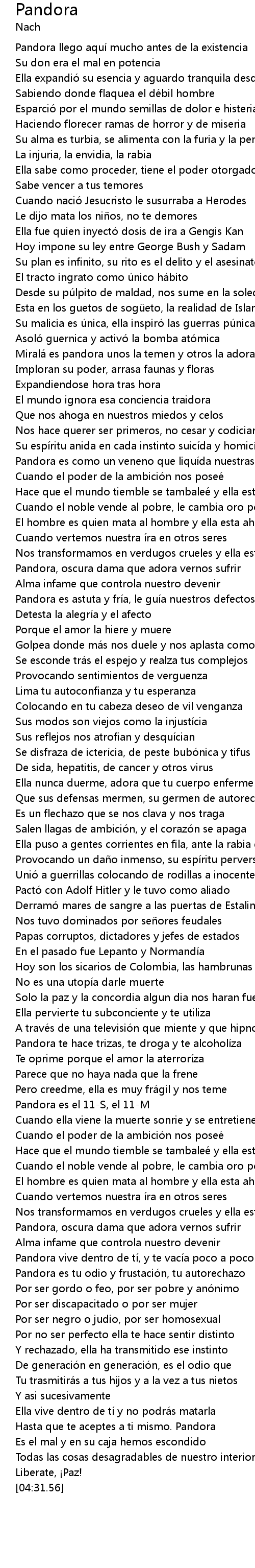 | [03:53.96] | Pandora es tu odio y frustación, tu autorechazo |