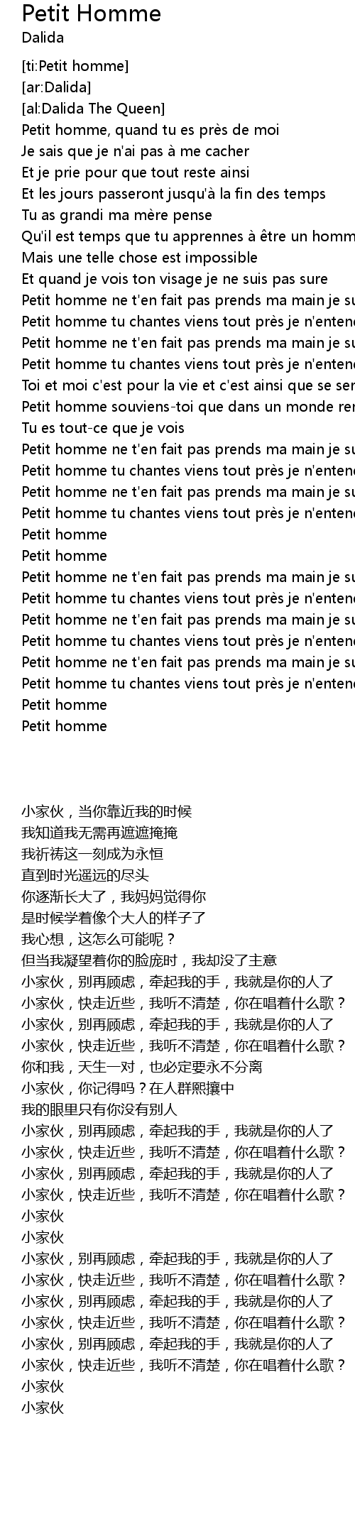 | [01:50.86] | Petit homme tu chantes viens tout pre s je n' entends pas |