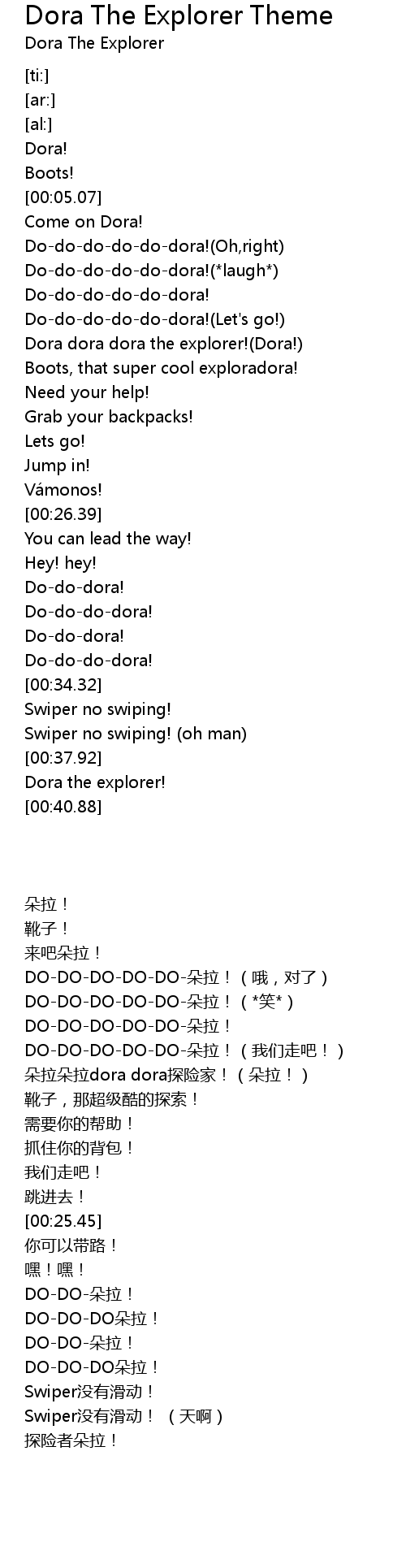 | [00:14.37] | Dora dora dora the explorer!(Dora!) |