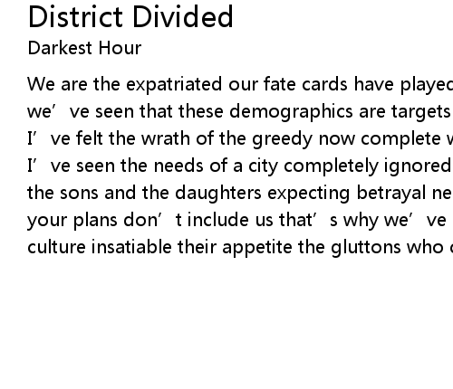 | I' ve seen the needs of a city completely ignored surrounded by vultures we are the sons and the daughters expecting betrayal neglecting our passions we know your plans don' t include us that' s why we' ve made our own destroyers of culture insatiable their appetite the gluttons who consumed their way to the top |