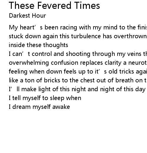 | My heart' s been racing with my mind to the finish line of these fevered times stuck down again this turbulence has overthrown tranquility pounding the walls inside these thoughts | |