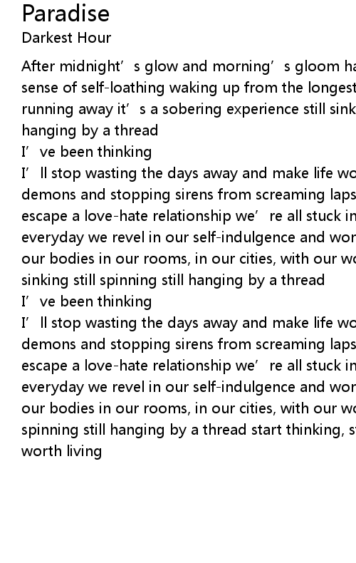 | I' ll stop wasting the days away and make life worth living controlling these demons and stopping sirens from screaming lapsing in and out of this great escape a lovehate relationship we' re all stuck in our ways and as we drown everyday we revel in our selfindulgence and wonder why we feel so trapped, in our bodies in our rooms, in our cities, with our words, with our words still sinking still spinning still hanging by a thread | |