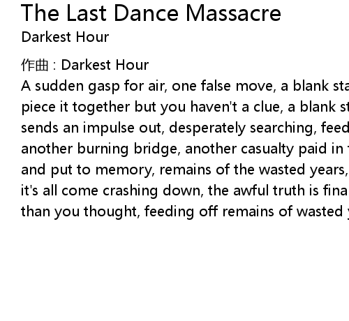 | A sudden gasp for air, one false move, a blank stare is waiting for you, try to piece it together but you haven' t a clue, a blank stare is waiting for you, it sends an impulse out, desperately searching, feeding off remains of it all, another burning bridge, another casualty paid in full, just let it crumble down, and put to memory, remains of the wasted years, it wouldn' t be the first time, it' s all come crashing down, the awful truth is finally out, it' s even worse than you thought, feeding off remains of wasted years. |