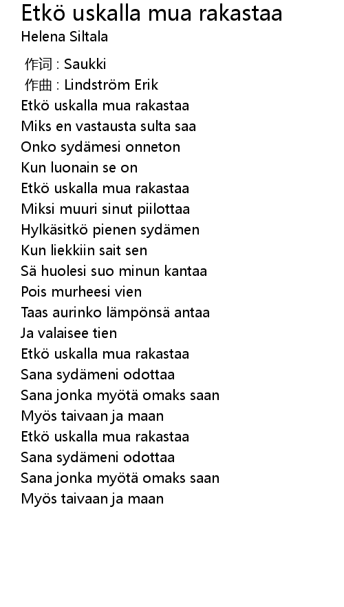 | [00:13.944] | Etk uskalla mua rakastaa |