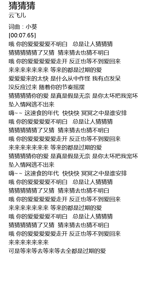 | [03:02.28] | 猜猜猜猜猜了又猜 猜来猜去也猜不明白 |