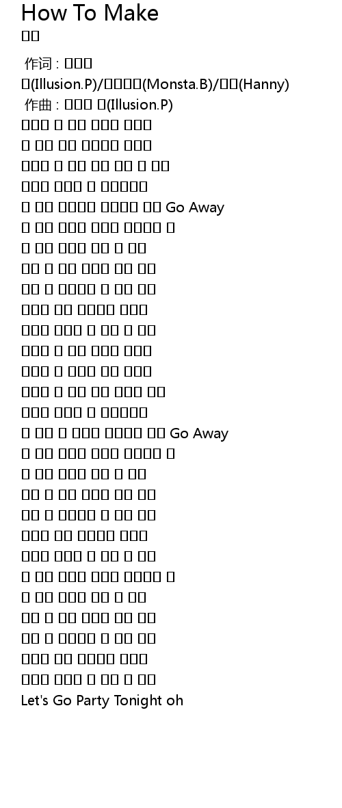 作词 : 일루션 피(Illusion.P)/몬스타비(Monsta.B)/해니(Hanny) |