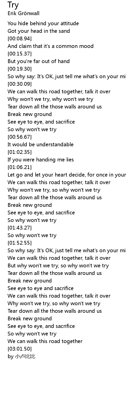 | [00:35.91] | Why won' t we try, why won' t we try |