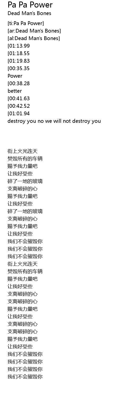 [00:53.76][01:01.94][01:10.30][01:56.22][02:04.06][02:12.19][02:20.67] We won't destroy you no we will not destroy you