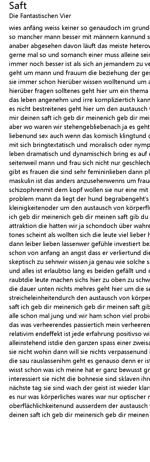 | wies anfäng weiss keiner so genaudoch im grunde sucht jeder mann eine frauwobei so mancher mann besser mit männern kannund so manche frau lässt lieber frauen anaber abgesehen davon läuft das meiste heterowobei mancheiner machts auch gerne mal so und somanch einer muss alleine seine frau seinen mann stehnwas immer noch besser ist als sich an jemandem zu vergehndoch zurück zum thema es geht um mann und frauum die beziehung der geschlechter und um den gvum alles was sie immer schon hierüber wissen wolltenund um alles was sie besser nicht hierüber fragen solltenes geht hier um ein thema das jeden interessiertes macht das leben angenehm und irre kompliziertich kann es nicht verleugnen und ich will es nicht bestreitenes geht hier um den austausch von körperflüssigkeitengib mir deinen saft ich geb dir meinenich geb dir meinen saft gib du mir deinenja aber wo waren wir stehengebliebenach ja es geht um leute die sich gegenseitig liebenund sex auch wenn das komisch klingtund dem was die thematik eben noch so mit sich bringtextatisch und moralisch oder nymphomanischbeziehungen machen das leben dramatisch und dynamischich bring es auf den punkt denn die sache hat zwei seitenweil mann und frau sich nicht nur geschlechtlich unterscheidenzum beispiel gibt es frauen die sind sehr femininlieben dann platonisch ihn und ihnund maskulin ist das anders anzusehenwenns um frauen geht werden männer schizophrenmit dem kopf wollen sie nur eine mit der hose alle habendas wird zum problem mann da liegt der hund begrabengeht's um grosse dinge oder um kleinigkeitenoder um den austausch von körperflüssigkeitengib mir deinen saft ich geb dir meinenich geb dir meinen saft gib du mir deinenes gibt die sexuelle attraktion die hatten wir ja schondoch über wahre liebe verliert niemand einen tones scheint als wollten sich die leute viel lieber hassenund wenn schon lieben dann leiber lieben lassenwer gefühle investiert beziehungen probierthat meisten schon von anfang an angst dass er verliertund diese angst führt dazu die liebe skeptisch zu sehnwir wissen ja genau wie solche sachen ausgehnwir wissen nichts und alles ist erlaubtso lang es beiden gefällt und nicht dem einen nur die zeit raubtdie leute machen sichs hier zu oben zu schwerund deshalb geht bei ihnen auf die dauer unten nichts mehres geht hier um die seelischen streicheleinheitendurch den austausch von körperflüssigkeitengib mir deinen saft ich geb dir meinenich geb dir meinen saft gib du mir deinenwir warn doch alle schon mal jung und wir ham schon viel probiertund dann kommts schon mal vor das was verheerendes passiertich mein verheerend oder nicht ist ohnehin sehr relativim endeffekt ist jede erfahrung positivso wie bei der frau die alleinstehend istdie den ganzen spass einer zweisamkeit vermisstund dann weiss sie nicht wohin dann will sie nichts verpassenund in diesem sinn geht sie aus die sau rauslassenihm geht es genauso denn er ist im singlefrustund auf ihr wisst schon was ich meine hat er ganz bewusst grosse lustmit oder ohne interessiert sie nicht die bohnesie sind sklaven ihrer eigenen hormoneder nächste tag sie sind wach der geist ist wieder klarund auch die erkenntnis das es nur was körperliches wares war nur optischer reiz von oberflächlichkeitenund ausserdem der austausch von körperflüssigkeitengib mir deinen saft ich geb dir meinenich geb dir meinen saft gib du mir deinen |