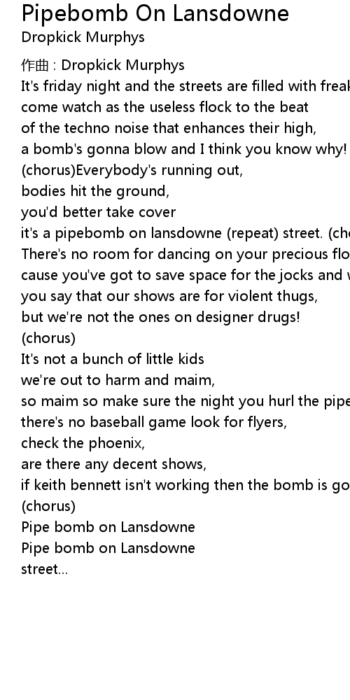 | it's a pipebomb on lansdowne (repeat) street. (chorus) | |
