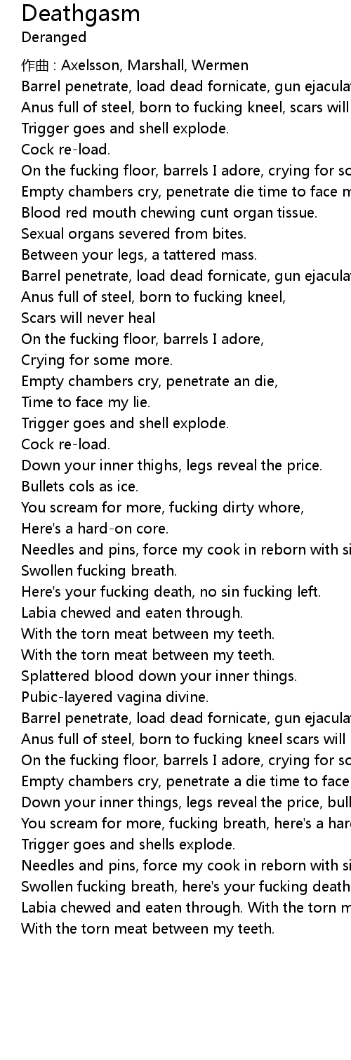 | Barrel penetrate, load dead fornicate, gun ejaculate. | |