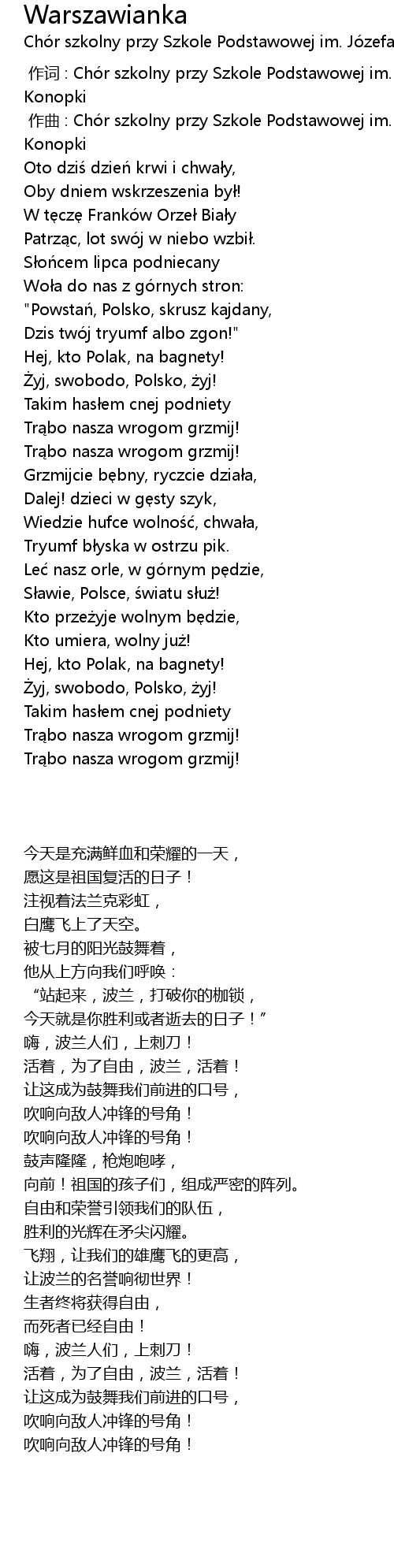 | [00:01.000] | 作曲 : Chór szkolny przy Szkole Podstawowej im. Józefa Nowina Konopki |