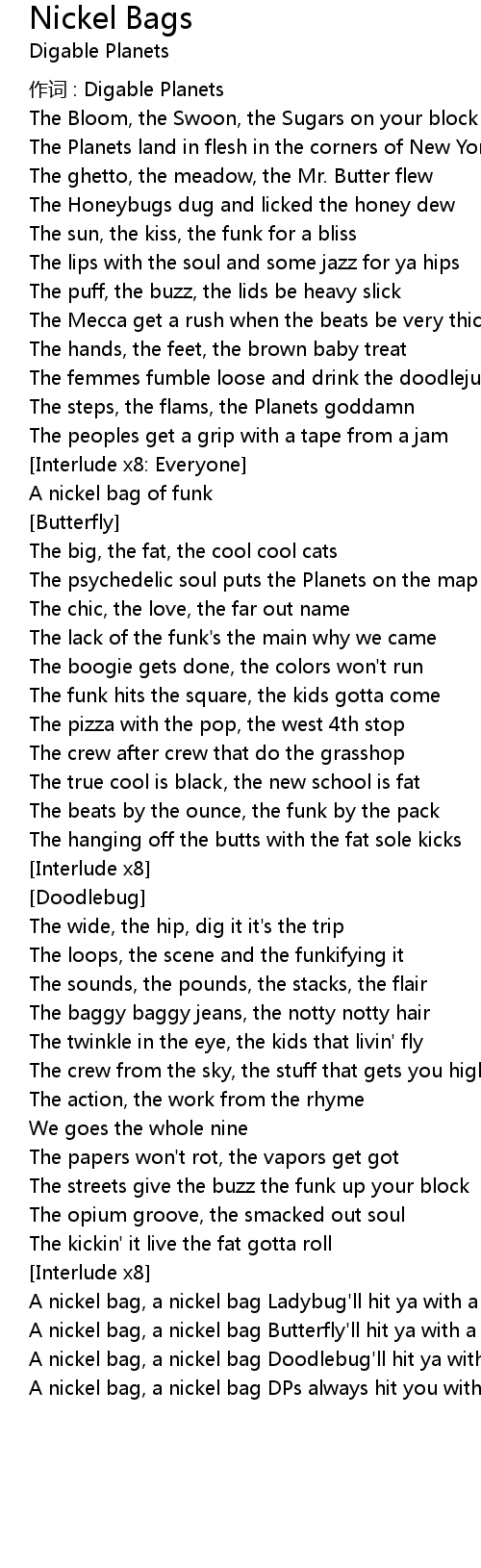 | A nickel bag, a nickel bag Doodlebug' ll hit ya with his nickel bag | |