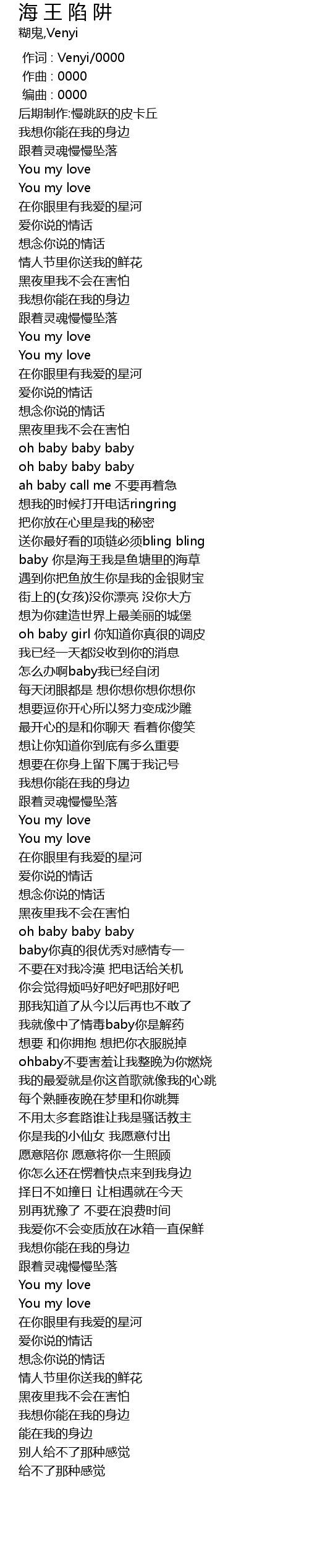 | [01:03.438] | baby nǐ shì hǎi wáng wǒ shì yú táng lǐ de hǎi cǎo |