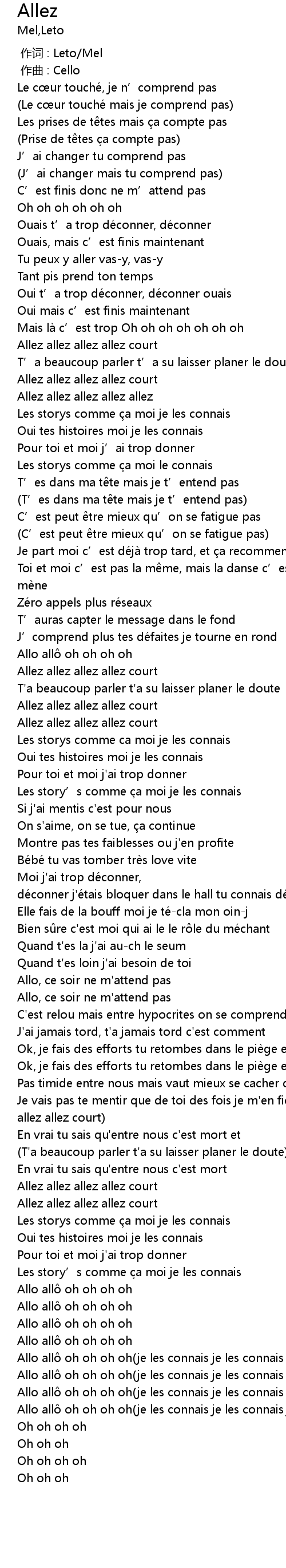 | [02:48.60] | Je vais pas te mentir que de toi des fois je m' en fiche Allez allez allez allez court |